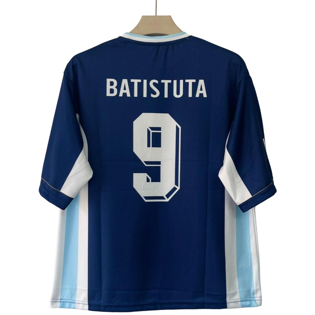 The product in the image is a replica of the Argentina national football team's away jersey from the 1998 FIFA World Cup, featuring the number 9, which was worn by Gabriel Batistuta.