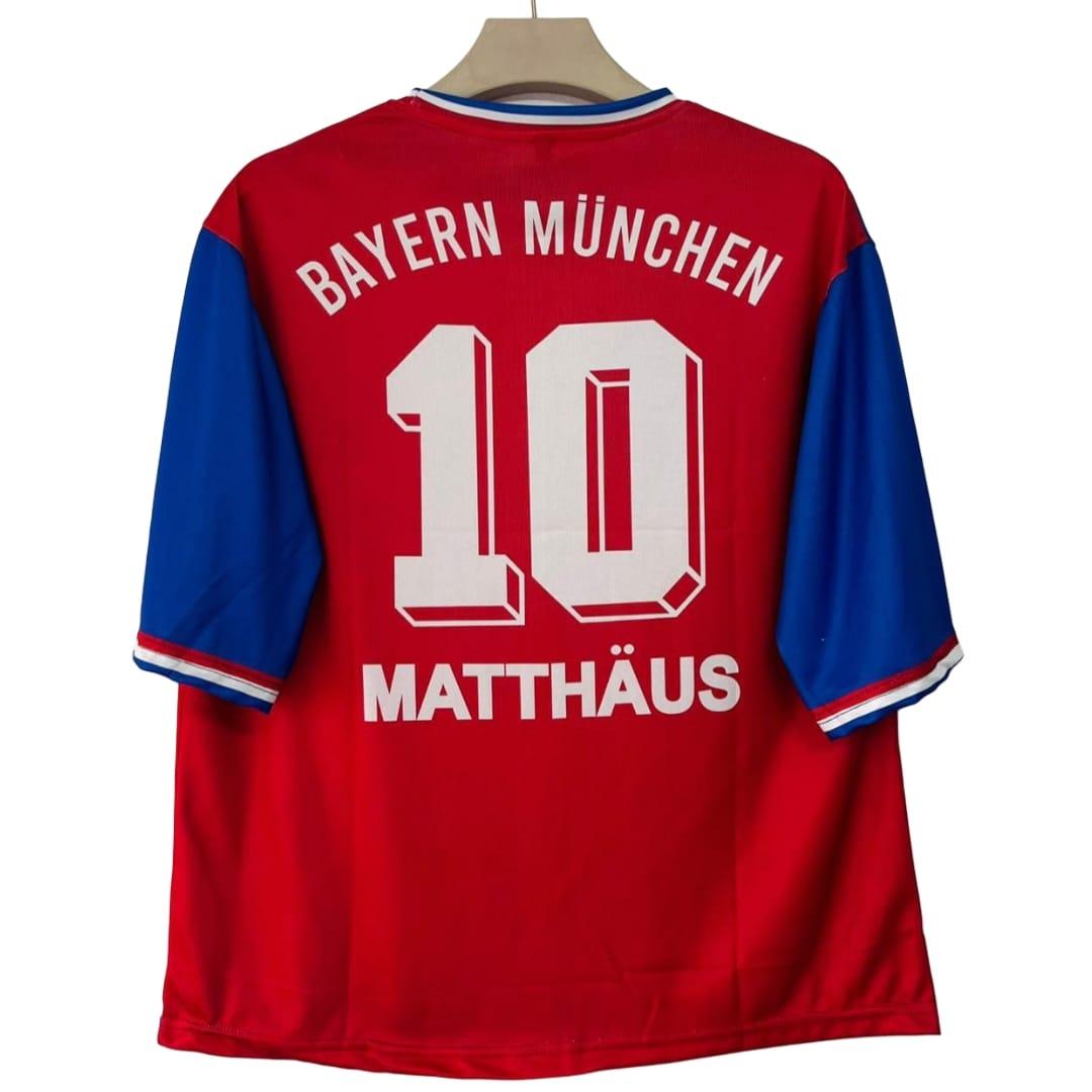 This is a vintage FC Bayern Munich home jersey from the 1993-1995 seasons. It features a red base with blue and white stripes, the Adidas Equipment logo, the FC Bayern Munich crest.