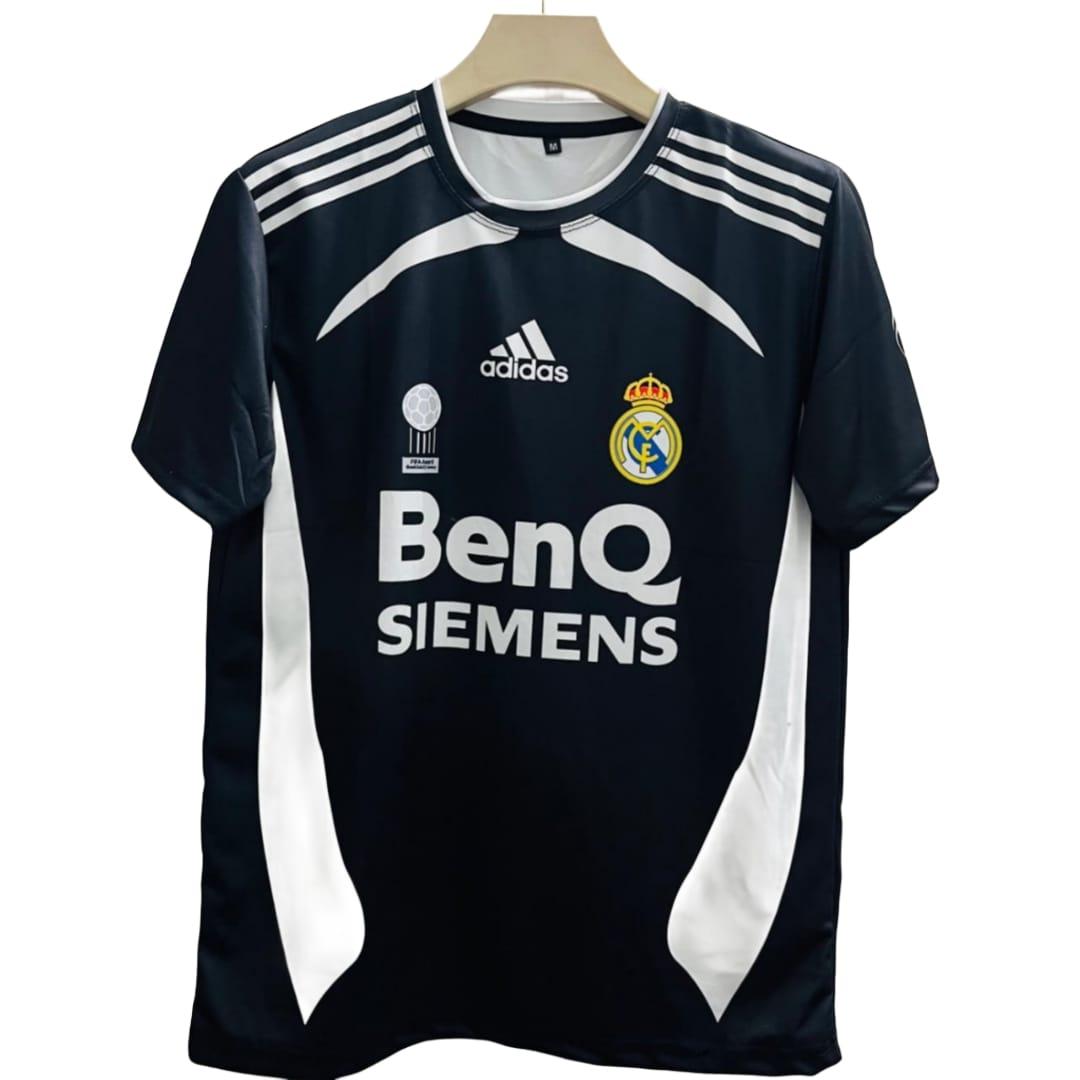 The image displays a replica of the Real Madrid 2006-07 Away Football Shirt. This retro jersey features the Adidas logo, the Real Madrid crest, and the "BenQ SIEMENS" sponsor logo on the front.